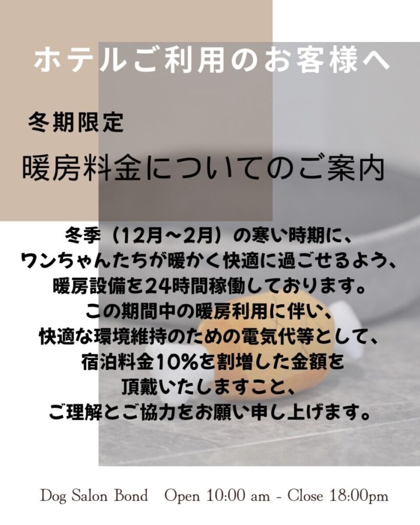 12月から2月の間、宿泊料金10%割増となりますのでご理解のほど、よろしくお願いいたします。